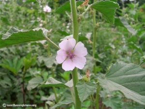 Althaea officinalis (marsh-mallow, marsh mallow, or common marshmallow) is a perennial species which is used as a medicinal plant and ornamental plant. A confection made from the root since ancient Egyptian time evolved into today’s marshmallow treat. The stems, which die down in the autumn, are erect, 3 to 4 ft (0.91 to 1.22 m), simple, or putting out only a few lateral branches. The leaves, shortly petioled, are roundish, ovate-cordate, 2 to 3 in (51 to 76 mm) long, and about 11⁄4 inch broad, entire or three to five lobed, irregularly toothed at the margin, and thick. They are soft and velvety on both sides, due to a dense covering of stellate hairs. The flowers are shaped like those of the common mallow, but are smaller and of a pale colour, and are either axillary, or in panicles, more often the latter.